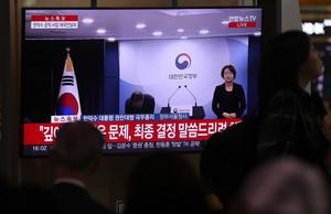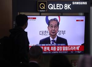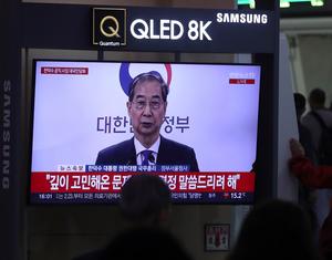 (250501) -- SEÚL, 1 mayo, 2025 (Xinhua) -- Personas observan un discurso televisado de Han Duck-soo en la Estación del...