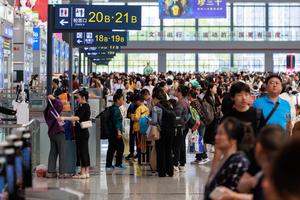 (250501) -- BEIJING, 1 mayo, 2025 (Xinhua) -- Pasajeros son vistos en la Estación del Ferrocarril de Hankou, en la...
