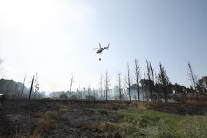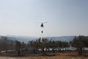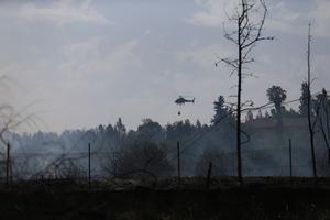 (250501) -- JERUSALEN, 1 mayo, 2025 (Xinhua) -- Un helicóptero participa en la extinción de incendios mientras un incendio forestal...