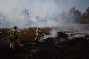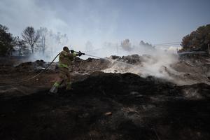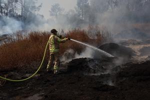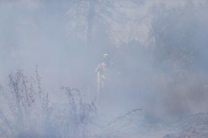 (250501) -- JERUSALEN, 1 mayo, 2025 (Xinhua) -- Un bombero extingue fuego mientras un incendio forestal arde por segundo día,...