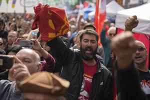(250501) -- QUITO, 1 mayo, 2025 (Xinhua) -- Personas tocan instrumentos musicales durante una marcha para conmemorar el Día Internacional...
