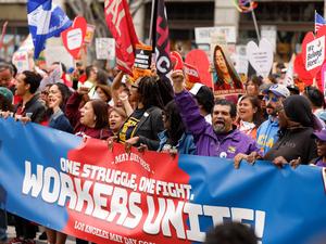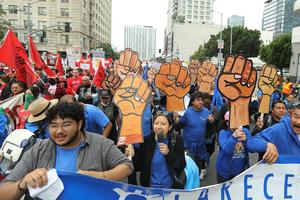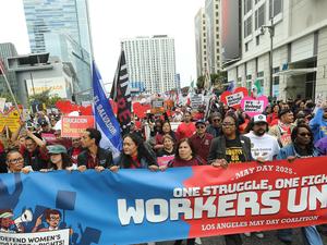 (250501) -- LOS ANGELES, 1 mayo, 2025 (Xinhua) -- Manifestantes marchan en el centro de Los Angeles, California, Estados Unidos,...