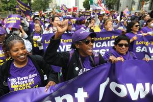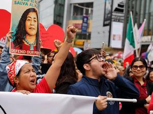 (250501) -- LOS ANGELES, 1 mayo, 2025 (Xinhua) -- Manifestantes se congregan en el centro de Los Angeles, California, Estados...