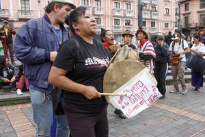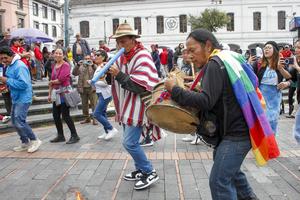 (250501) -- QUITO, 1 mayo, 2025 (Xinhua) -- Una mujer sostiene un cartel mientras baila y toca un tambor andino...