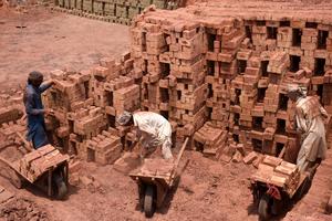 (250501) -- LAHORE, 1 mayo, 2025 (Xinhua) -- Trabajadores laboran en un horno de ladrillos, en Lahore, Pakistán, el 1 de mayo de 2025. (Xinhua/Sajjad) (da) (ra) (vf)