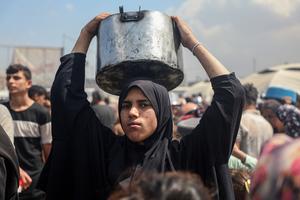 (250502) -- GAZA, 2 mayo, 2025 (Xinhua) -- Una palestina espera para recibir alimentos gratuitos de un centro de distribución de alimentos, en la Ciudad de Gaza, el 2 de mayo de 2025. La Agencia de las Naciones Unidas para los Refugiados de Palestina en Oriente Próximo dijo el viernes que el actual bloqueo israelí está agravando la situación humanitaria en la Franja de Gaza, afectando particularmente a mujeres y niños. (Xinhua/Rizek Abdeljawad) (jg) (da) (ce)