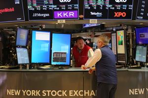 (250502) -- NUEVA YORK, 2 mayo, 2025 (Xinhua) -- Corredores de bolsa conversan en el piso de la Bolsa de...