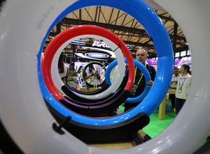 (250505) -- SHANGHAI, 5 mayo, 2025 (Xinhua) -- Un visitante observa llantas durante la Feria Internacional de Bicicletas de China...