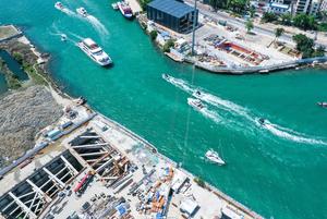 (250505) -- SANYA, 5 mayo, 2025 (Xinhua) -- Trabajadores laboran en el sitio de construcción del proyecto de paso del...