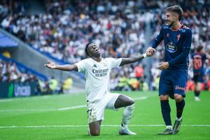 (250505) -- MADRID, 5 mayo, 2025 (Xinhua) -- Imagen del 4 de mayo de 2025 de Vinicius Junior (i), de...