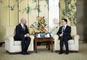 (250506) -- BEIJING, 6 mayo, 2025 (Xinhua) -- El vicepresidente chino, Han Zheng, se reúne con el expresidente del Consejo Europeo, Charles Michel, antes de asistir a una recepción para celebrar el 50º aniversario de las relaciones diplomáticas entre China y la Unión Europea (UE), en Beijing, capital de China, el 6 de mayo de 2025. (Xinhua/Li Tao) (jg) (ra) (ce)