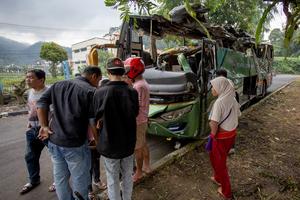 (250506) -- SUMATRA OCCIDENTAL, 6 mayo, 2025 (Xinhua) -- Personas permanecen cerca de los restos de un autobús tras un...