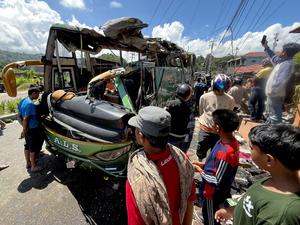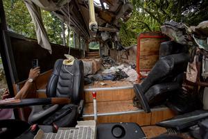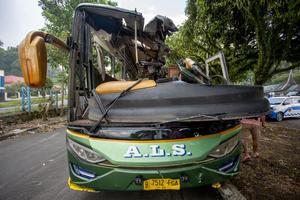 (250506) -- SUMATRA OCCIDENTAL, 6 mayo, 2025 (Xinhua) -- Los restos de un autobús son vistos tras un accidente, en...