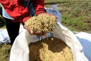 (250506) -- SUKOHARJO, 6 mayo, 2025 (Xinhua) -- Un agricultor sostiene arroz con cáscara después de molerlo durante la época...