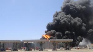 (250505) -- HUDAYDA, 5 mayo, 2025 (Xinhua) -- Captura de pantalla de un video que muestra fuego y humo saliendo...