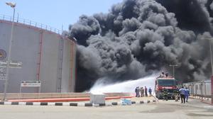 (250505) -- PUERTO DE SUDAN, 5 mayo, 2025 (Xinhua) -- Bomberos combaten un incendio después de un ataque con drones...
