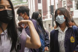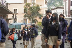 (250505) -- QUITO, 5 mayo, 2025 (Xinhua) -- Estudiantes portan mascarillas como medida de prevención por la alerta epidemiológica generada...