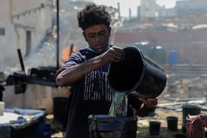 (250507) -- GAZA, 7 mayo, 2025 (Xinhua) -- Imagen del 29 de abril de 2025 de un palestino trabajando en un taller improvisado para fabricar combustible a partir de residuos plásticos, en la Ciudad de Gaza. En un taller improvisado entre las ruinas del oeste de la Ciudad de Gaza, un grupo de palestinos está atareado desglosando diversos artículos de plástico desechados y fundiéndolos en grandes contenedores de metal. Están convirtiendo los residuos en combustible para hacer frente a la escasez causada por el bloqueo israelí, que ha durado más de dos meses. (Xinhua/Rizek Abdeljawad) (jg) (da) (vf)