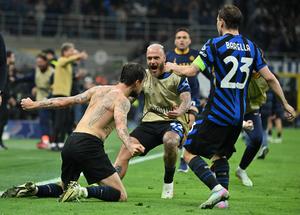 (250507) -- MILÁN, 7 mayo, 2025 (Xinhua) -- Imagen del 6 de mayo de 2025 de Denzel Dumfries (i), y...