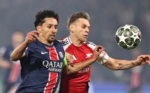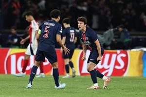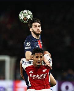 (250508) -- PARIS, 8 mayo, 2025 (Xinhua) -- Imagen del 7 de mayo de 2025 de Marquinhos (i), de Paris...