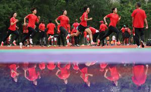 (250509) -- GUANGZHOU, 9 mayo, 2025 (Xinhua) -- Atletas de China asisten a una sesión de entrenamiento previo al Campeonato...