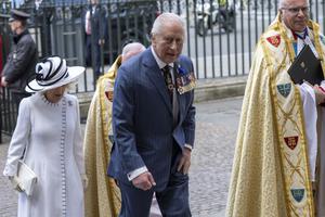 (250509) -- LONDRES, 9 mayo, 2025 (Xinhua) -- Imagen del 8 de mayo de 2025 del rey Carlos III (c),...