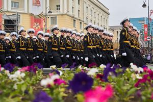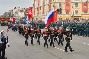 (250509) -- VLADIVOSTOK, 9 mayo, 2025 (Xinhua) -- Militares marchando en formación son vistos durante un desfile militar para conmemorar...