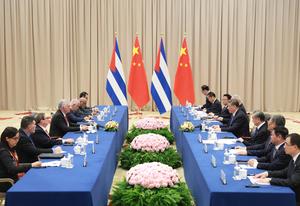 (250509) -- MOSCU, 9 mayo, 2025 (Xinhua) -- El presidente chino, Xi Jinping, se reúne con el presidente cubano, Miguel...