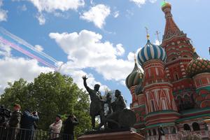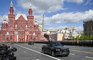 (250509) -- MOSCU, 9 mayo, 2025 (Xinhua) -- El ministro de Defensa ruso, Andrei Belousov (frente), pasa revista a las...