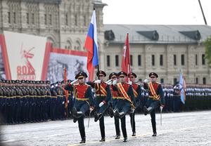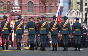 (250509) -- MOSCU, 9 mayo, 2025 (Xinhua) -- Miembros de una guardia de honor asisten a un gran desfile para...