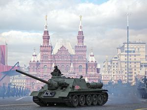 (250509) -- MOSCU, 9 mayo, 2025 (Xinhua) -- Vehículos blindados de combate Su-100 circulan durante un gran desfile para conmemorar...