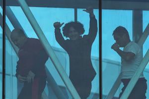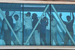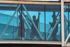 (250509) -- LA GUAIRA, 9 mayo, 2025 (Xinhua) -- Ciudadanos venezolanos deportados desde Estados Unidos reaccionan a su llegada al...