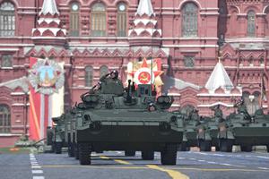 (250509) -- MOSCU, 9 mayo, 2025 (Xinhua) -- Vehículos de combate de infantería circulan durante un gran desfile para conmemorar...