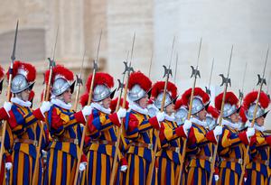 (250509) -- CIUDAD DEL VATICANO, 9 mayo, 2025 (Xinhua) -- Imagen del 8 de mayo de 2025 de guardias suizos...
