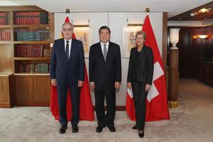 (250510) -- GINEBRA, 10 mayo, 2025 (Xinhua) -- Karin Keller-Sutter, presidenta de la Confederación Suiza, y Guy Parmelin, vicepresidente del...