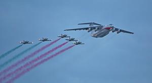 (250510) -- MINSK, 10 mayo, 2025 (Xinhua) -- Imagen del 9 de mayo de 2025 de aeronaves volando en formación...