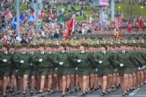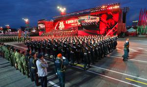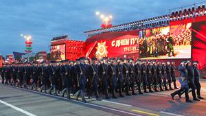 (250510) -- MINSK, 10 mayo, 2025 (Xinhua) -- Imagen del 9 de mayo de 2025 de soldados marchando durante un...
