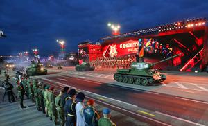 (250510) -- MINSK, 10 mayo, 2025 (Xinhua) -- Imagen del 9 de mayo de 2025 de tanques marchando durante un...
