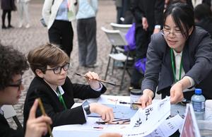 (250509) -- LONDRES, 9 mayo, 2025 (Xinhua) -- Imagen del 8 de mayo de 2025 de estudiantes asistiendo a un taller de caligrafía china durante un evento para celebrar el Día del Idioma Chino, en Londres, Reino Unido. Un evento para celebrar el Día del Idioma Chino de este año se realizó el jueves en Londres, reuniendo a unos 100 estudiantes de seis escuelas de Reino Unido para celebrar el idioma y la cultura china. (Xinhua/Jia Yuchen) (oa) (ra) (vf)