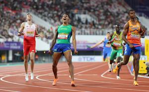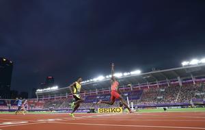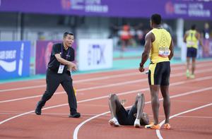(250512) -- GUANGZHOU, 12 mayo, 2025 (Xinhua) -- Imagen del 11 de mayo de 2025 de Akani Simbine (i), del...