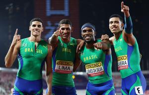 (250512) -- GUANGZHOU, 12 mayo, 2025 (Xinhua) -- (De izq. a der.) Imagen del 11 de mayo de 2025 de Lucas Carvalho, Matheus Lima, Tiago Lemes da Silva y Elías Oliveira, del equipo de Brasil posando después de la segunda ronda de clasificación de relevos 4x400m masculinos de los Relevos Mundiales de Atletismo de Guangzhou 2025, en Guangzhou, en la provincia de Guangdong, en el sur de China. (Xinhua/Li Ming) (rtg) (ah) (ce)