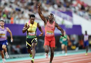 (250512) -- GUANGZHOU, 12 mayo, 2025 (Xinhua) -- Imagen del 11 de mayo de 2025 de Eliezer Adjibi (d), del equipo de Canadá, festejando después de la final de relevos 4x100m por equipos mixtos de los Relevos Mundiales de Atletismo de Guangzhou 2025, en Guangzhou, en la provincia de Guangdong, en el sur de China. (Xinhua/Liu Dawei) (rtg) (ah) (ce)
