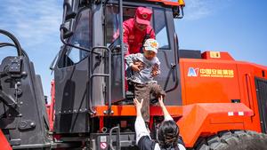 (250511) -- BEIJING, 11 mayo, 2025 (Xinhua) -- Un niño prueba un vehículo especial de ingeniería durante una actividad sobre...