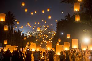 (250512) -- MAGELANG, 12 mayo, 2025 (Xinhua) -- Personas lanzan linternas de oración durante las celebraciones del Día de Vesak...