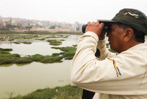 (250510) -- LIMA, 10 mayo, 2025 (Xinhua) -- Un hombre participa en el evento de avistamiento mundial de aves Global Big Day 2025 en el Humedal Pantanos de Villa, en el distrito de Chorrillos, en Lima, Perú, el 10 de mayo de 2025. Los peruanos participan muy emocionados el sábado en el Global Big Day 2025 con el propósito de recuperar el liderazgo de avistamiento mundial de aves, luego de haber alcanzado el año anterior el segundo lugar solo detrás de Colombia. (Xinhua/Mariana Bazo) (mb) (jg) (da)