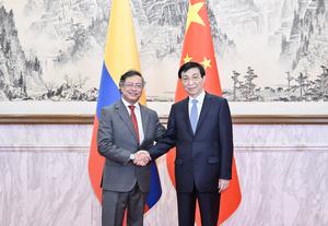 (250514) — BEIJING, 14 mayo, 2025 (Xinhua) — Wang Huning, miembro del Comité Permanente del Buró Político del Comité Central del Partido Comunista de China y presidente del Comité Nacional de la Conferencia Consultiva Política del Pueblo Chino, se reúne con el presidente de Colombia, Gustavo Petro, que se encuentra en Beijing para participar en la cuarta reunión ministerial del Foro China-CELAC (Comunidad de Estados Latinoamericanos y Caribeños), en Beijing, capital de China, el 14 de mayo de 2025. (Xinhua/Yue Yuewei) (jg) (da) (ce)