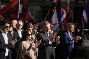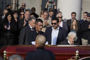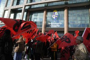 (250514) -- MONTEVIDEO, 14 mayo, 2025 (Xinhua) -- El presidente uruguayo, Yamandú Orsi (c), aplaude durante el cortejo fúnebre del...