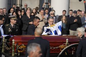 (250514) -- MONTEVIDEO, 14 mayo, 2025 (Xinhua) -- Personas participan durante el cortejo fúnebre del expresidente uruguayo, José "Pepe" Mujica,...