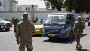 (250513) -- TRIPOLI, 13 mayo, 2025 (Xinhua) -- Personal de seguridad del Gobierno libio mantiene el orden en una calle,...