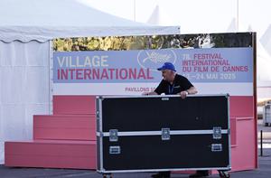 (250513) -- CANNES, 13 mayo, 2025 (Xinhua) -- Imagen del 12 de mayo de 2025 de un trabajador realizando preparativos...